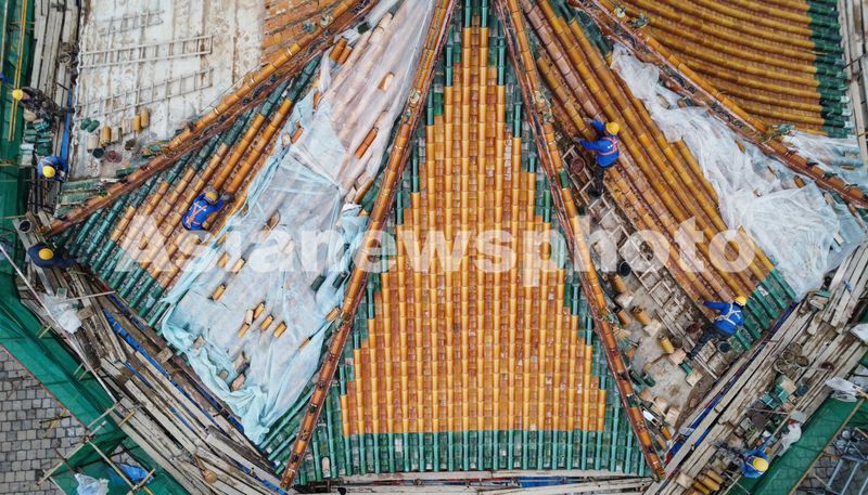 图片说明:4月13日,施工人员在沈阳故宫大政殿顶部进行作业。