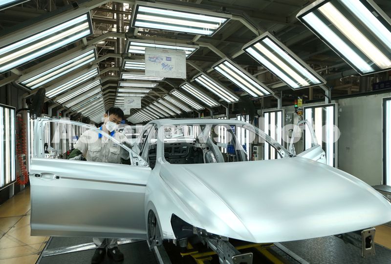 图片说明:2025年4月15日,在位于青岛市即墨区的一汽-大众青岛基地焊装车间,工人在进行生产作业。