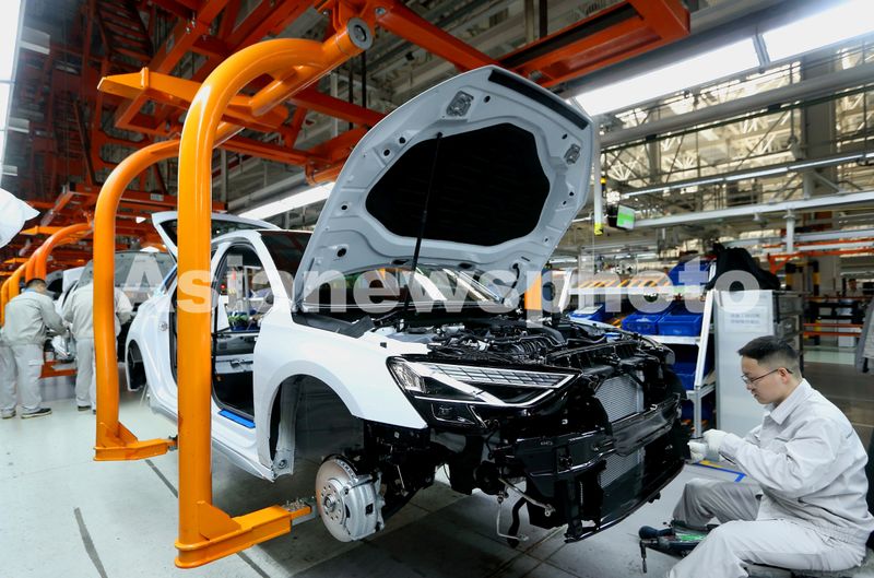 图片说明:2025年4月15日,在位于青岛市即墨区的一汽-大众青岛基地总装车间,工人在组装汽车。
