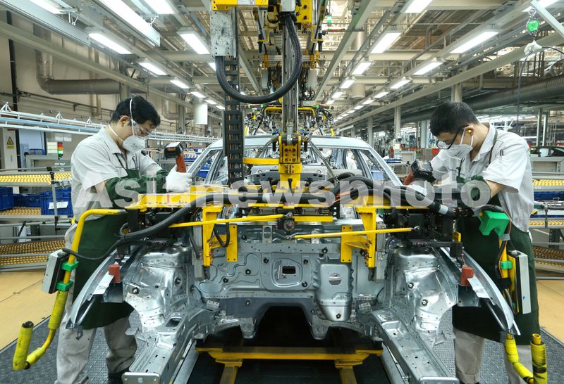 图片说明:2025年4月15日,在位于青岛市即墨区的一汽-大众青岛基地焊装车间,工人在进行生产作业。