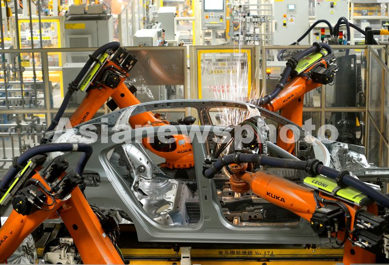 图片说明:2025年4月15日,在位于青岛市即墨区的一汽-大众青岛基地焊装车间,机器人在进行焊接作业。