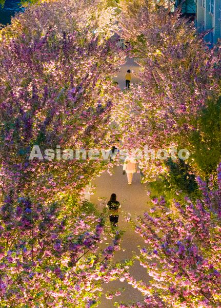 图片说明:4月15日,贵州省六盘水市水城河畔,夜幕下的樱花吸引市民驻足欣赏。
