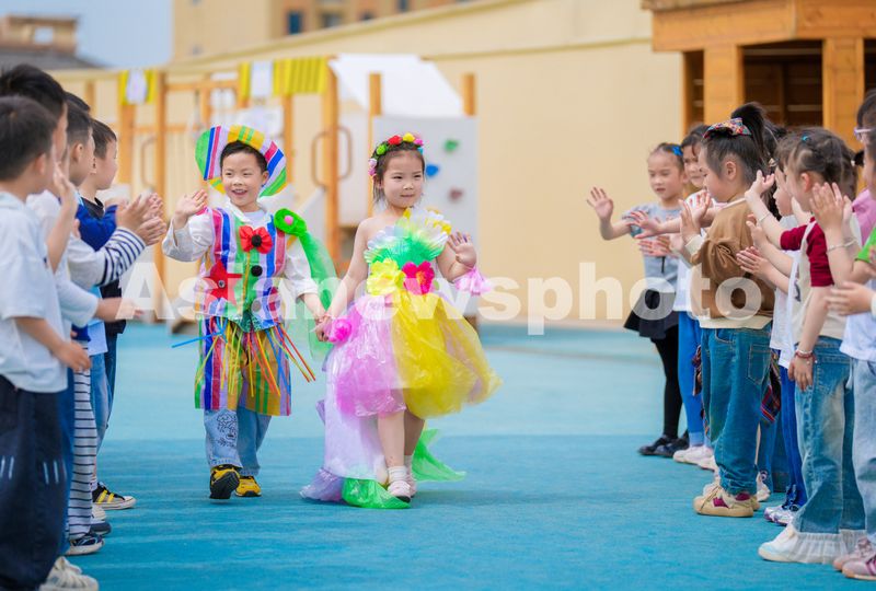 图片说明:2025年4月17日,孩子们身穿着由废旧物品制作出的各种环保服装进行走秀展示。