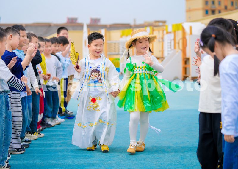 图片说明:2025年4月17日,孩子们身穿着由废旧物品制作出的各种环保服装进行走秀展示。