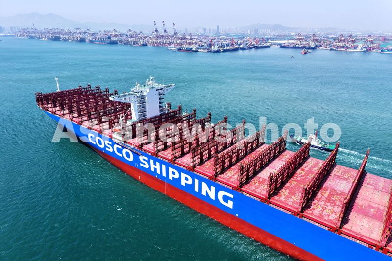 2025年4月16日,山东港口青岛港,完成特检面貌一新的“中海大西洋”轮驶入港口装载外贸集装箱。