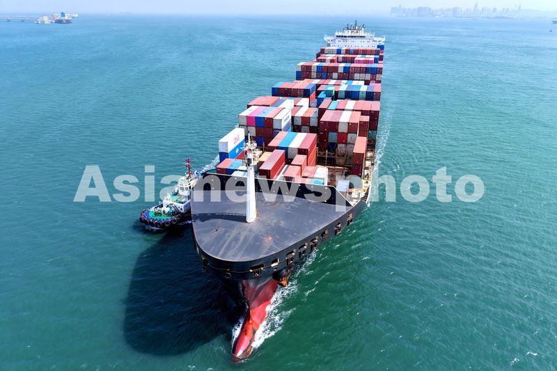 2025年4月16日,山东港口青岛港,装载外贸集装箱的货轮在驶入港口。