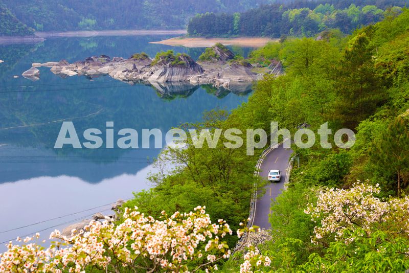 图片说明:2025年4月17日,自驾游车行驶在重庆市黔江区小南海国家地质公园桐花掩映的绕湖公路上。