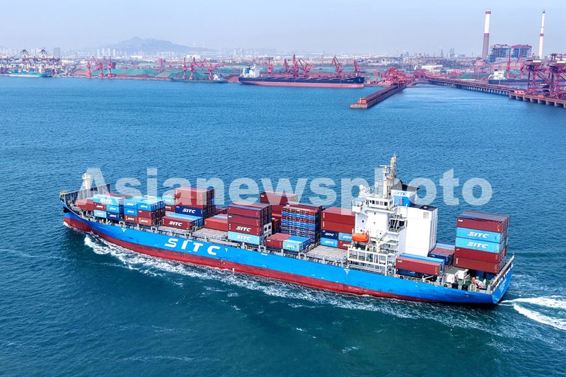 2025年4月16日,山东港口青岛港,装载外贸集装箱的货轮在驶入港口。