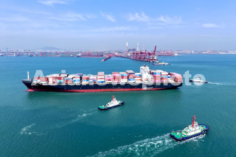 2025年4月16日,山东港口青岛港,装载外贸集装箱的货轮在驶入港口。