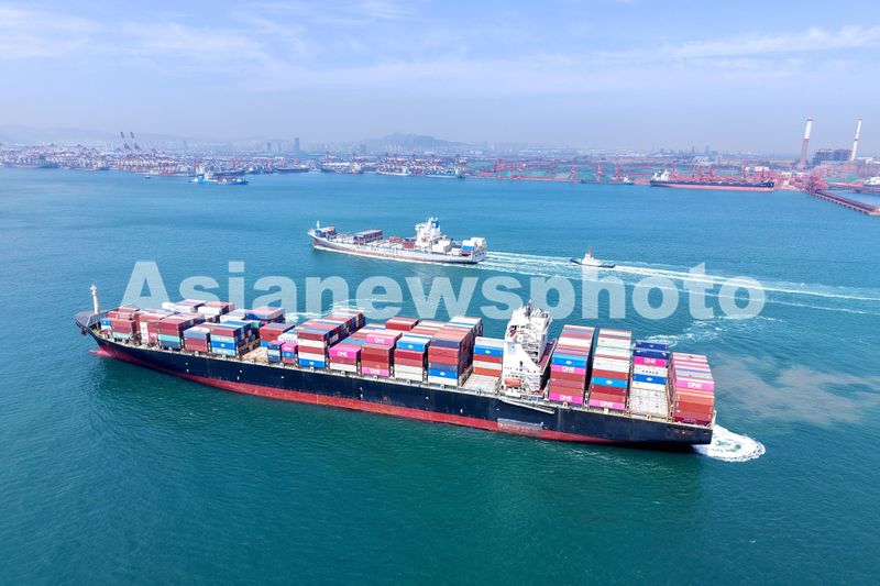 2025年4月16日,山东港口青岛港,装载外贸集装箱的货轮在驶入港口。