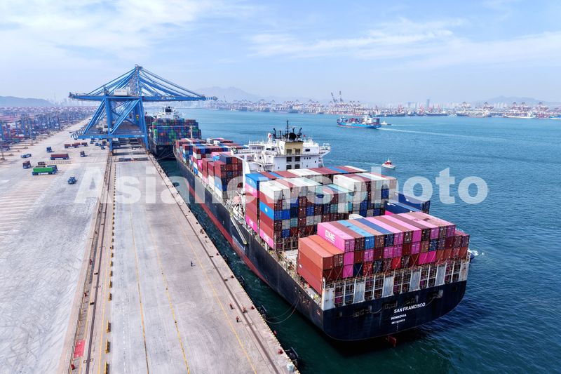 2025年4月16日,山东港口青岛港,货轮在装卸外贸集装箱。