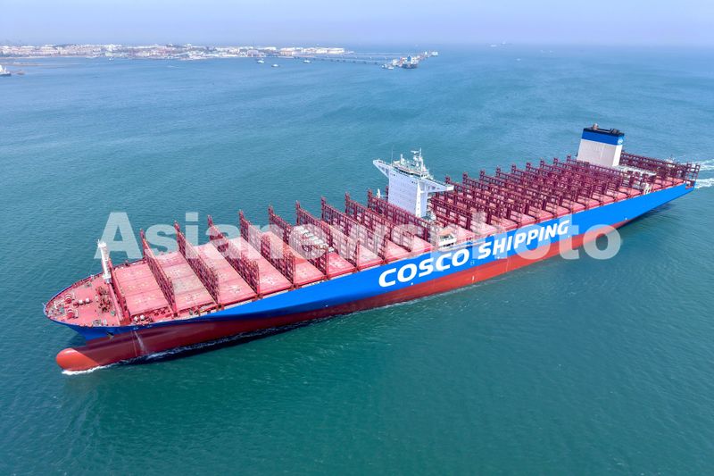 2025年4月16日,山东港口青岛港,完成特检面貌一新的“中海大西洋”轮驶入港口装载外贸集装箱。