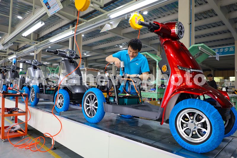 2025年4月17日,浙江省台州市三门县沿海工业园区,浙江纬领新能源科技有限公司电动车生产车间,工人正在组装电动车。浙江纬领新能源科技有限公司集设计、研发、制造和营销于一体的老年出行代步车交通工具制造企业,产品远销欧洲、深受外国老年群体喜爱的老年代步车。
