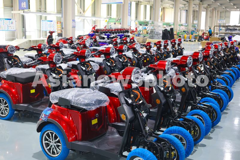 2025年4月17日,浙江省台州市三门县沿海工业园区,浙江纬领新能源科技有限公司电动车生产车间,工人正在组装电动车。浙江纬领新能源科技有限公司集设计、研发、制造和营销于一体的老年出行代步车交通工具制造企业,产品远销欧洲、深受外国老年群体喜爱的老年代步车。