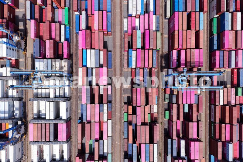 2025年4月16日,山东港口青岛港,外贸集装箱码头堆放的集装箱。