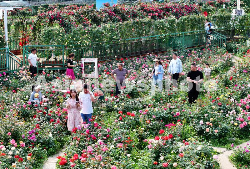 图片说明:2025年4月20日,湖南省衡阳市珠晖区茶山坳镇,游客在金甲玫瑰花园里游玩。