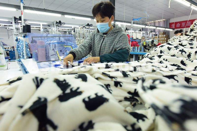 图片说明:2025年4月21日,江苏省连云港市东海县洪庄镇铭汇服饰有限公司正在赶制外贸出口订单毛绒睡衣。