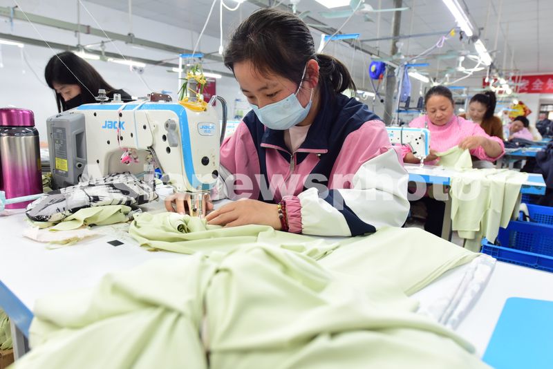 图片说明:2025年4月21日,江苏省连云港市东海县洪庄镇玉荣服饰有限公司正在赶制外贸出口订单防晒服。