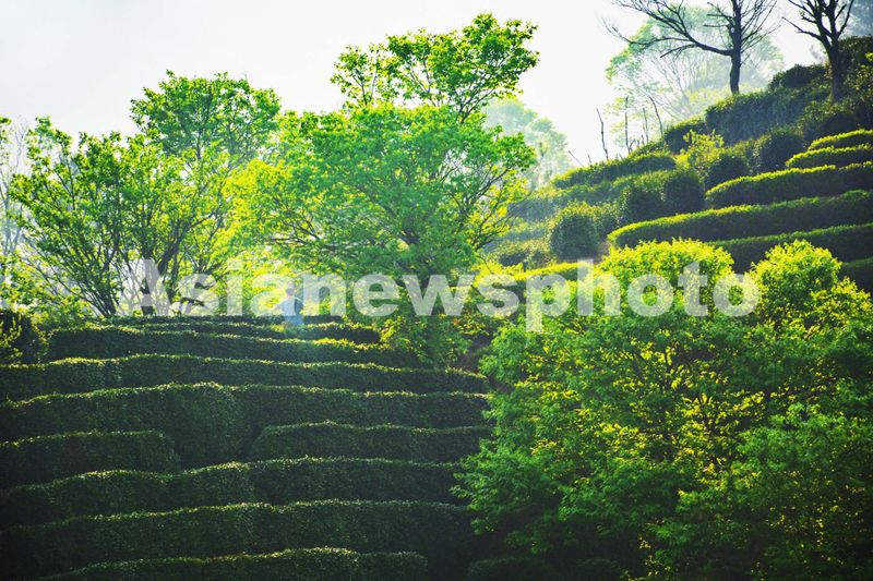图片说明:2025年4月20日,在安徽省安庆市岳西县响肠镇千佛塔村生态茶园,村民在采茶。