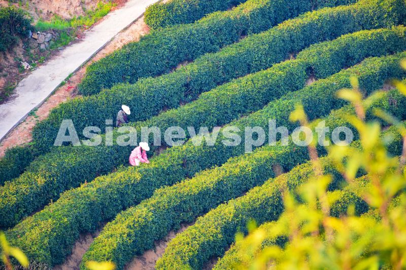 图片说明:2025年4月20日,在安徽省安庆市岳西县响肠镇千佛塔村生态茶园,村民在采茶。