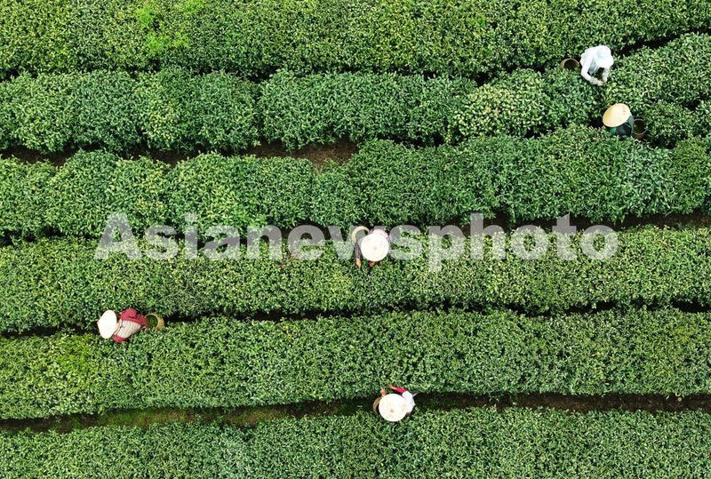 2025年4月20日,采茶工在杭州西湖龙井茶园里采摘西湖龙井嫩芽。