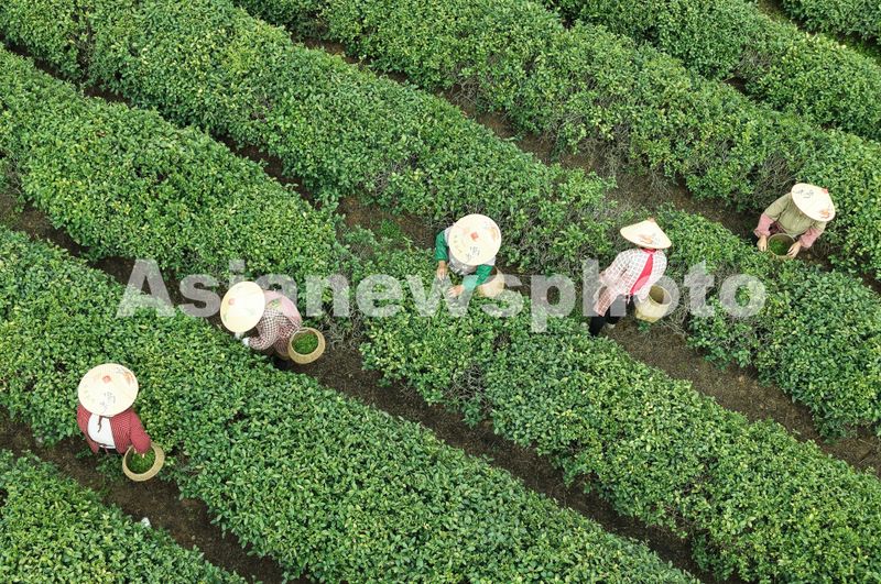 2025年4月20日,采茶工在杭州西湖龙井茶园里采摘西湖龙井嫩芽。