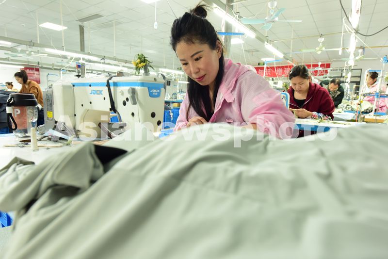 图片说明:2025年4月21日,江苏省连云港市东海县洪庄镇玉荣服饰有限公司正在赶制外贸出口订单防晒服。