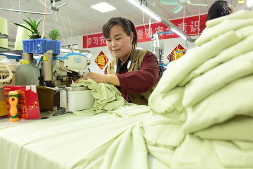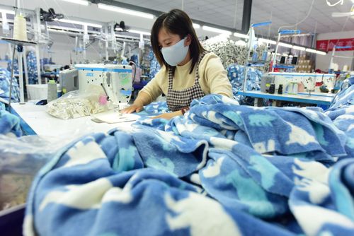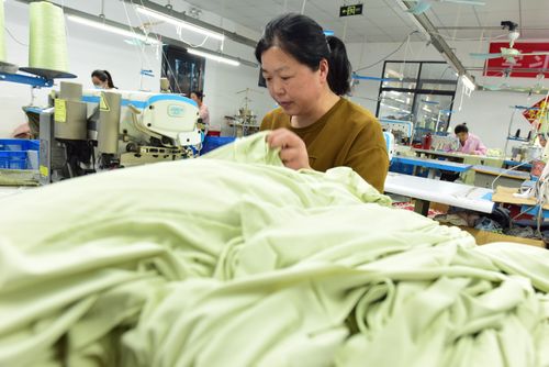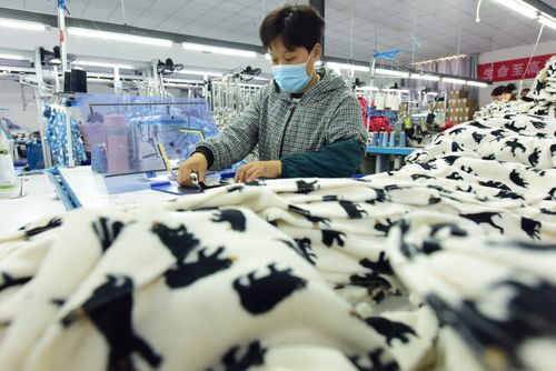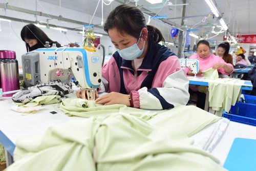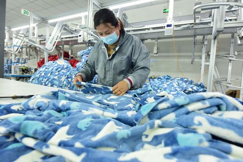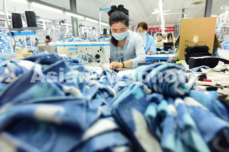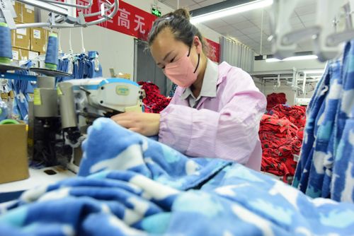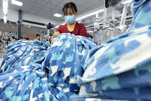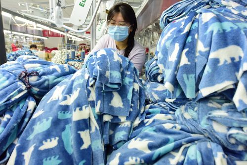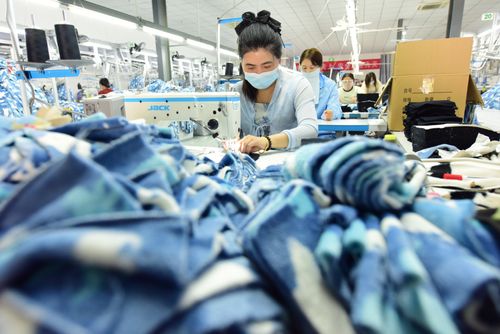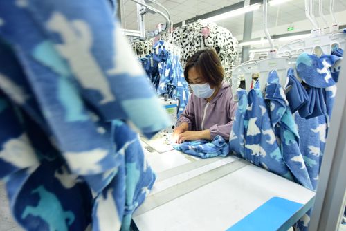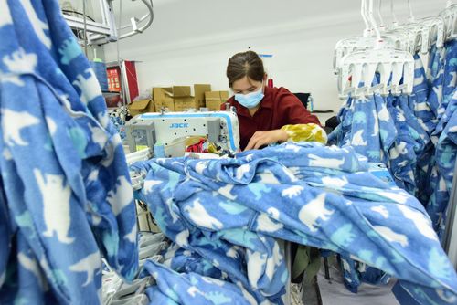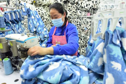 图片说明:2025年4月21日,江苏省连云港市东海县洪庄镇铭汇服饰有限公司正在赶制外贸出口订单毛绒睡衣。