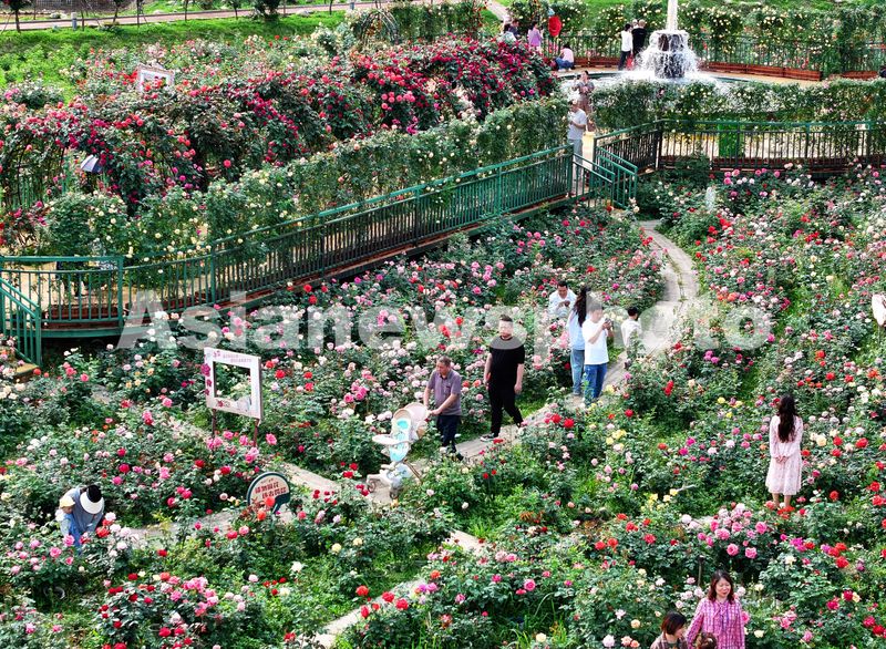 图片说明:2025年4月20日,湖南省衡阳市珠晖区茶山坳镇,游客在金甲玫瑰花园里游玩。