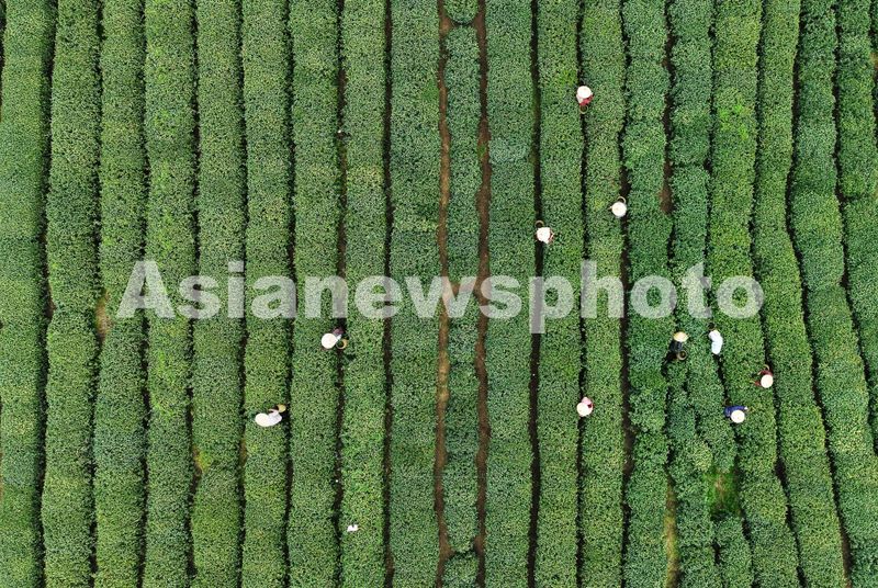 2025年4月20日,采茶工在杭州西湖龙井茶园里采摘西湖龙井嫩芽。