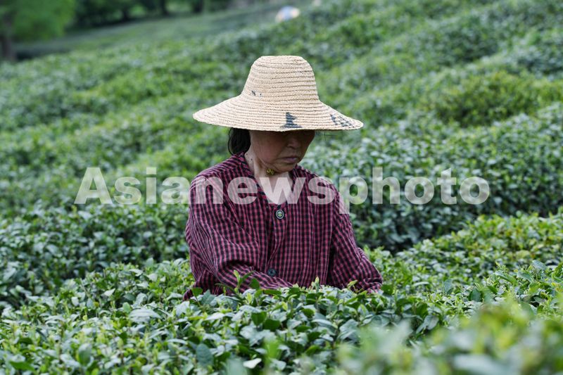 2025年4月20日,采茶工在杭州西湖龙井茶园里采摘西湖龙井嫩芽。