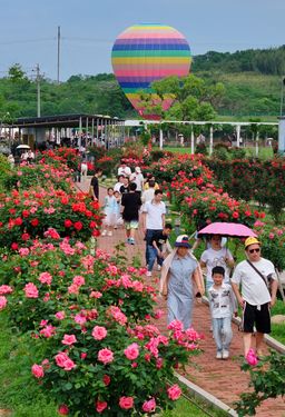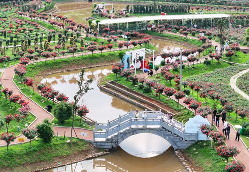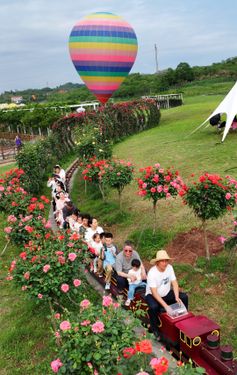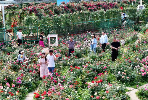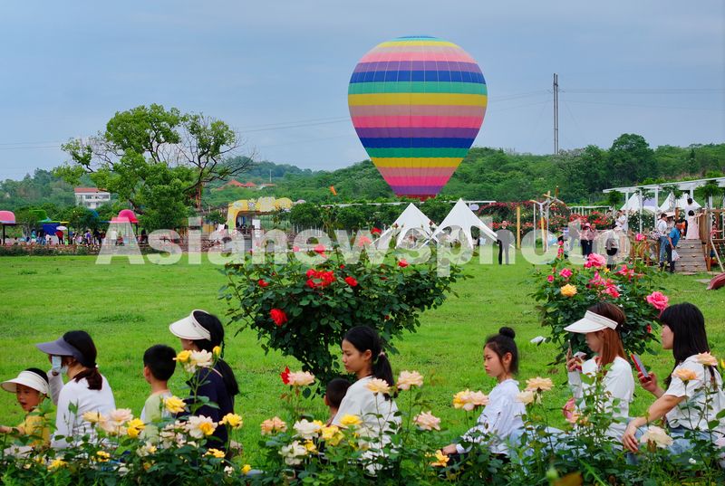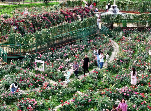 图片说明:2025年4月20日,湖南省衡阳市珠晖区茶山坳镇,游客在金甲玫瑰花园里游玩。