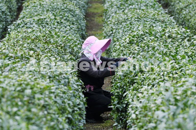 2025年4月20日,采茶工在杭州西湖龙井茶园里采摘西湖龙井嫩芽。