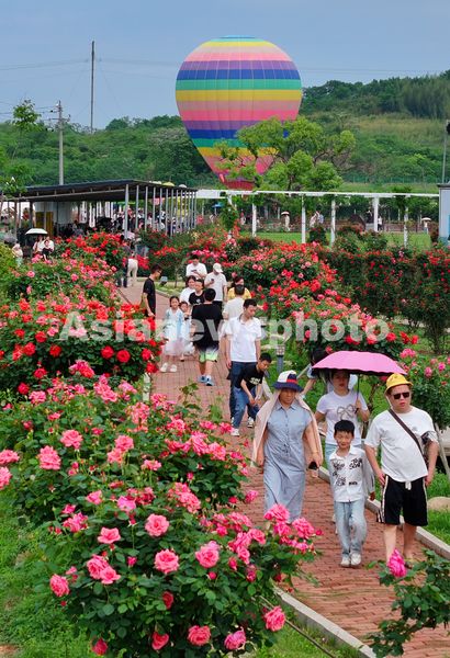 图片说明:2025年4月20日,湖南省衡阳市珠晖区茶山坳镇,游客在金甲玫瑰花园里游玩。