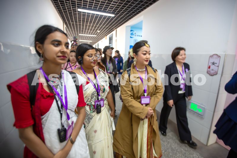 图片说明:2025年4月21日,河南省安阳市紫薇小学,在该校老师的引领下,参加2025中国(安阳)国际汉字大会的国际留学生前去观看紫薇小学文化社团孩子们的皮影戏表演。