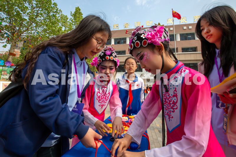 图片说明:2025年4月21日,河南省安阳市紫薇小学,参加2025中国(安阳)国际汉字大会的国际留学生、来自韩国首尔明洞的女生正在与该校手工社团的女生交流互动,学习如何制作“中国结”。