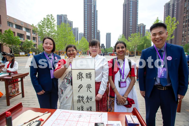 图片说明:2025年4月21日,河南省安阳市紫薇小学,来自印度东部西孟加拉邦的国际留学生杜欣雅(中文名,左二)、高冰颖(中文名,右二)与该校的领导、老师合影留念。