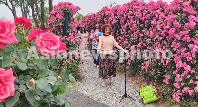 图片说明:4月22日,湖北省武汉市东西湖区国家城市湿地公园的金银湖公园月季花园,形成一道道花墙和一片片花海,吸引了众多市民、游客前来赏玩打卡。