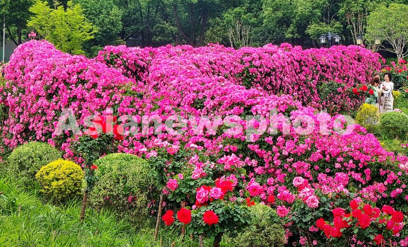 图片说明:4月22日,湖北省武汉市东西湖区国家城市湿地公园的金银湖公园月季花园,形成一道道花墙和一片片花海,吸引了众多市民、游客前来赏玩打卡。