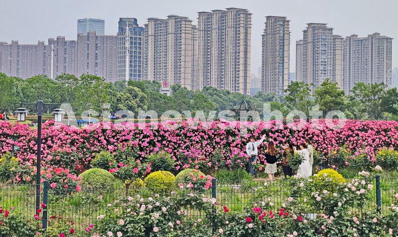 图片说明:4月22日,湖北省武汉市东西湖区国家城市湿地公园的金银湖公园月季花园,形成一道道花墙和一片片花海,吸引了众多市民、游客前来赏玩打卡。