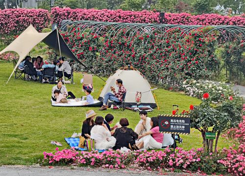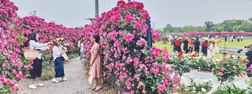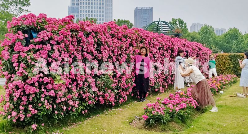 图片说明:4月22日,湖北省武汉市东西湖区国家城市湿地公园的金银湖公园月季花园,形成一道道花墙和一片片花海,吸引了众多市民、游客前来赏玩打卡。