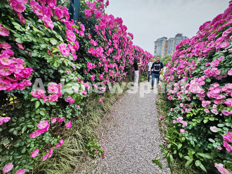 图片说明:4月22日,湖北省武汉市东西湖区国家城市湿地公园的金银湖公园月季花园,形成一道道花墙和一片片花海,吸引了众多市民、游客前来赏玩打卡。