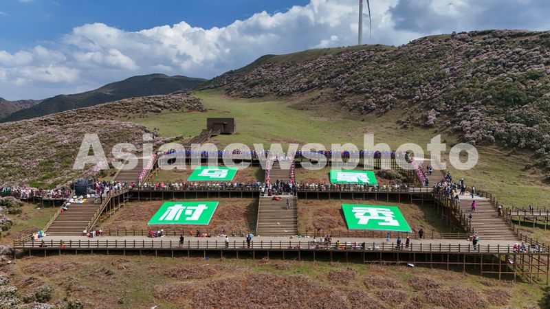 图片说明:2025年4月20日,贵州省六盘水市盘州市乌蒙大草原景区“乌蒙村秀”在竞相绽放的高山矮杜鹃花海中精彩上演。