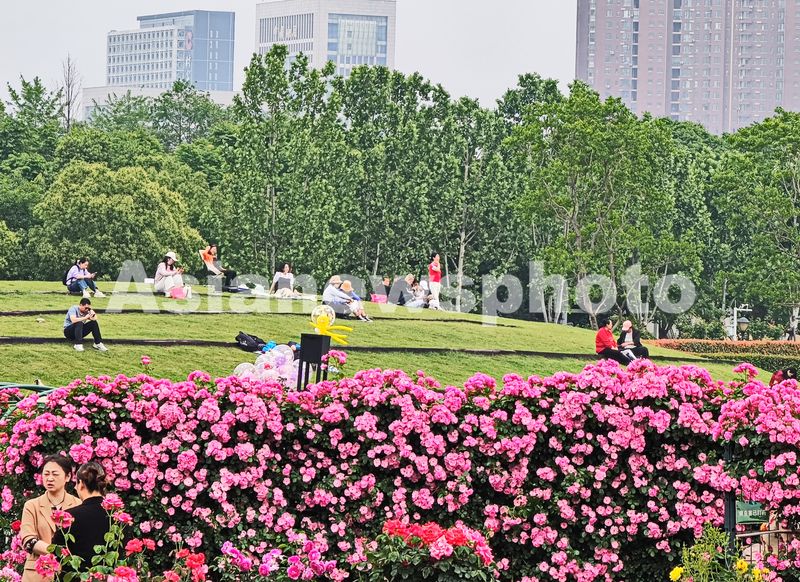 图片说明:4月22日,湖北省武汉市东西湖区国家城市湿地公园的金银湖公园月季花园,形成一道道花墙和一片片花海,吸引了众多市民、游客前来赏玩打卡。