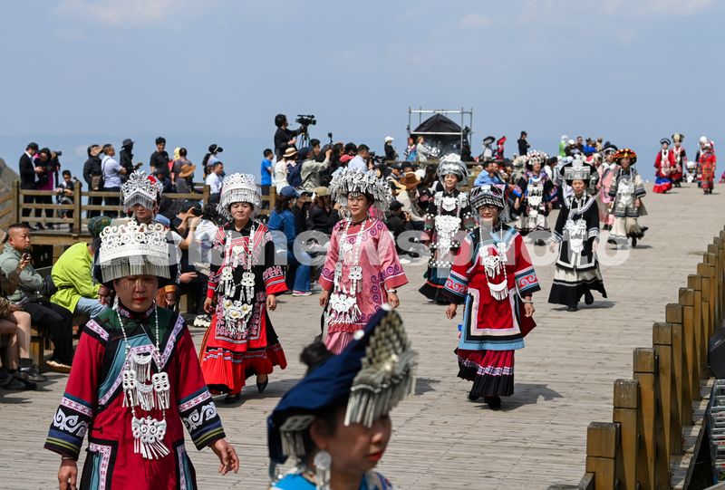 图片说明:2025年4月20日,贵州省六盘水市盘州市乌蒙大草原景区,身着民族服装的妇女在“乌蒙村秀”活动中走秀。