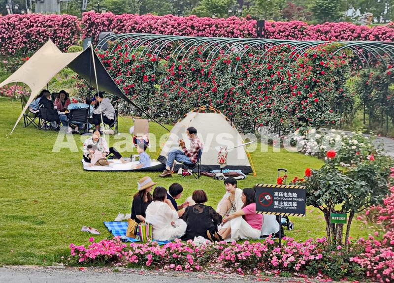 图片说明:4月22日,湖北省武汉市东西湖区国家城市湿地公园的金银湖公园月季花园,形成一道道花墙和一片片花海,吸引了众多市民、游客前来赏玩打卡。