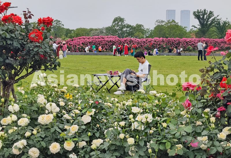 图片说明:4月22日,湖北省武汉市东西湖区国家城市湿地公园的金银湖公园月季花园,形成一道道花墙和一片片花海,吸引了众多市民、游客前来赏玩打卡。