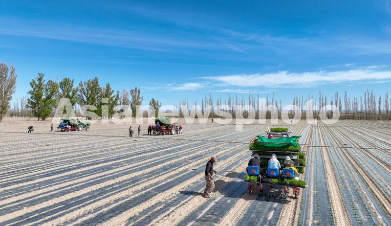 2025年4月23日,甘肃农垦亚盛金塔分公司的辣椒种植基地,工人利用装有北斗卫星导航系统的辣椒移栽机在田间有序作业。