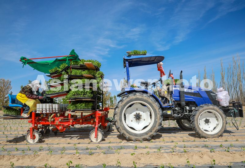 2025年4月23日,甘肃农垦亚盛金塔分公司的辣椒种植基地,工人利用装有北斗卫星导航系统的辣椒移栽机在田间有序作业。