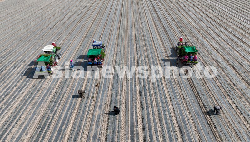 2025年4月23日,甘肃农垦亚盛金塔分公司的辣椒种植基地,工人利用装有北斗卫星导航系统的辣椒移栽机在田间有序作业。